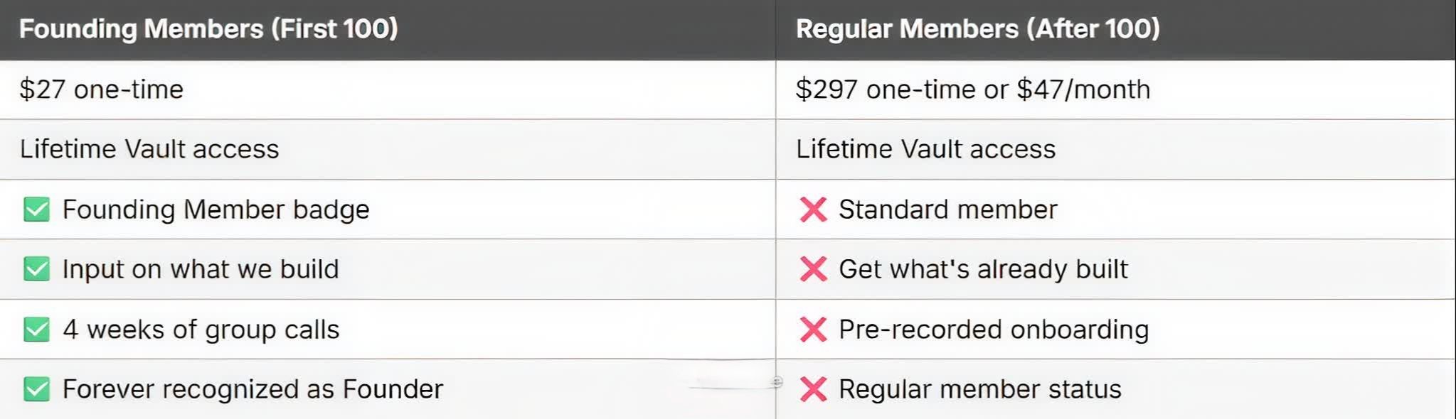 đ° Locked-In Pricing Pay $27 once, get lifetime access to everythingâcurrent materials, future updates, all Vault additions, and permanent community membership. New members after you will pay 10x more and won't get Founding Member benefits.